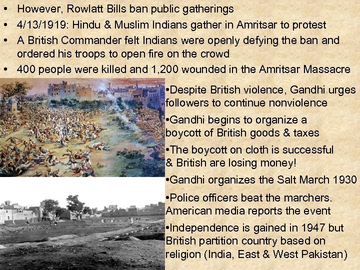 • However, Rowlatt Bills ban public gatherings • 4/13/1919: Hindu & Muslim Indians gather in Amritsar to protest • A British Commander felt Indians were openly defying the ban and ordered his troops to open fire on the crowd • 400 people were killed and 1, 200 wounded in the Amritsar Massacre • Despite British violence, Gandhi urges followers to continue nonviolence • Gandhi begins to organize a boycott of British goods & taxes • The boycott on cloth is successful & British are losing money! • Gandhi organizes the Salt March 1930 • Police officers beat the marchers. American media reports the event • Independence is gained in 1947 but British partition country based on religion (India, East & West Pakistan)