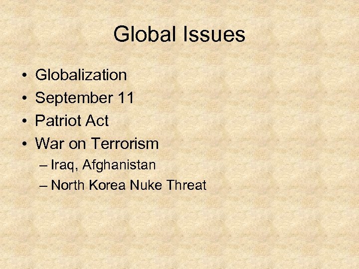 Global Issues • • Globalization September 11 Patriot Act War on Terrorism – Iraq, Afghanistan – North Korea Nuke Threat