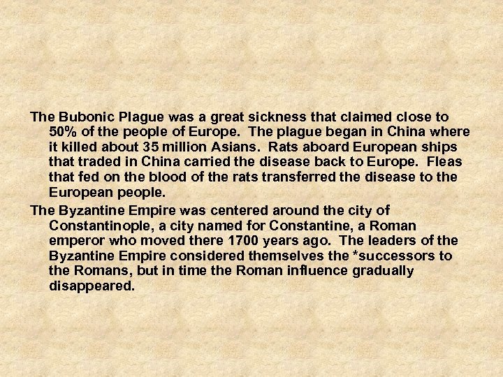 The Bubonic Plague was a great sickness that claimed close to 50% of the people of Europe. The plague began in China where it killed about 35 million Asians. Rats aboard European ships that traded in China carried the disease back to Europe. Fleas that fed on the blood of the rats transferred the disease to the European people. The Byzantine Empire was centered around the city of Constantinople, a city named for Constantine, a Roman emperor who moved there 1700 years ago. The leaders of the Byzantine Empire considered themselves the *successors to the Romans, but in time the Roman influence gradually disappeared.