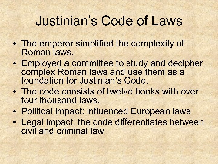 Justinian’s Code of Laws • The emperor simplified the complexity of Roman laws. • Employed a committee to study and decipher complex Roman laws and use them as a foundation for Justinian’s Code. • The code consists of twelve books with over four thousand laws. • Political impact: influenced European laws • Legal impact: the code differentiates between civil and criminal law