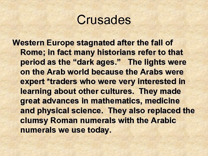 Crusades Western Europe stagnated after the fall of Rome; in fact many historians refer to that period as the “dark ages. ” The lights were on the Arab world because the Arabs were expert *traders who were very interested in learning about other cultures. They made great advances in mathematics, medicine and physical science. They also replaced the clumsy Roman numerals with the Arabic numerals we use today.