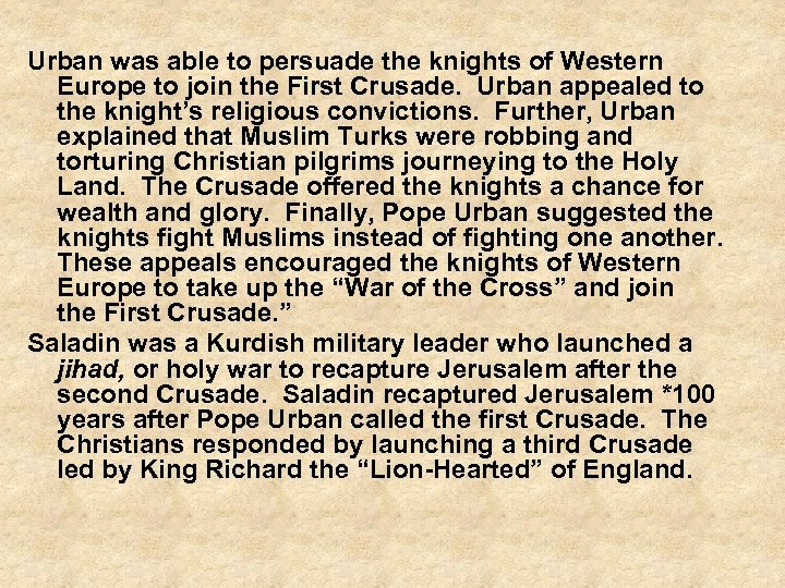 Urban was able to persuade the knights of Western Europe to join the First Crusade. Urban appealed to the knight’s religious convictions. Further, Urban explained that Muslim Turks were robbing and torturing Christian pilgrims journeying to the Holy Land. The Crusade offered the knights a chance for wealth and glory. Finally, Pope Urban suggested the knights fight Muslims instead of fighting one another. These appeals encouraged the knights of Western Europe to take up the “War of the Cross” and join the First Crusade. ” Saladin was a Kurdish military leader who launched a jihad, or holy war to recapture Jerusalem after the second Crusade. Saladin recaptured Jerusalem *100 years after Pope Urban called the first Crusade. The Christians responded by launching a third Crusade led by King Richard the “Lion-Hearted” of England.