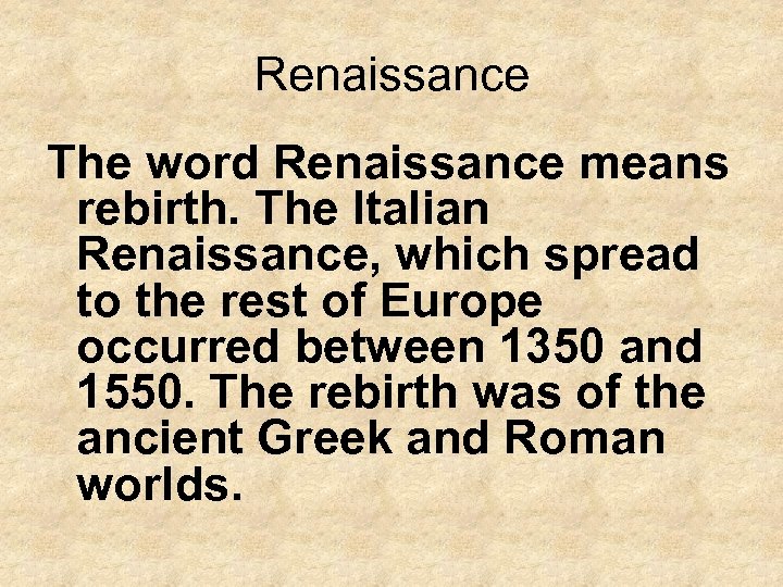 Renaissance The word Renaissance means rebirth. The Italian Renaissance, which spread to the rest of Europe occurred between 1350 and 1550. The rebirth was of the ancient Greek and Roman worlds.