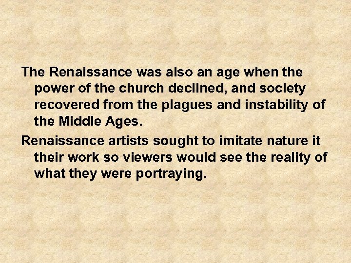The Renaissance was also an age when the power of the church declined, and society recovered from the plagues and instability of the Middle Ages. Renaissance artists sought to imitate nature it their work so viewers would see the reality of what they were portraying.