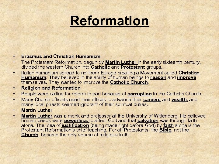 Reformation • • Erasmus and Christian Humanism The Protestant Reformation, begun by Martin Luther in the early sixteenth century, divided the western Church into Catholic and Protestant groups. Italian humanism spread to northern Europe creating a Movement called Christian Humanism. They believed in the ability of human beings to reason and improve themselves. They wanted to improve the Catholic Church. Religion and Reformation People were calling for reform in part because of corruption in the Catholic Church. Many Church officials used their offices to advance their careers and wealth, and many local priests seemed ignorant of their spiritual duties. Martin Luther was a monk and professor at the University of Wittenberg. He believed human deeds were powerless to affect God and that salvation was through faith alone. The idea of justification (being made right before God) by faith alone is the Protestant Reformation’s chief teaching. For all Protestants, the Bible, not the Church, became the only source of religious truth.