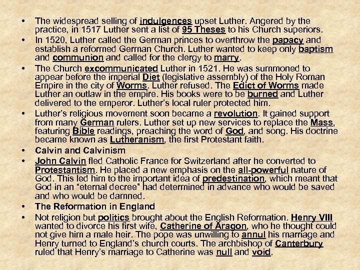 • • The widespread selling of indulgences upset Luther. Angered by the practice, in 1517 Luther sent a list of 95 Theses to his Church superiors. In 1520, Luther called the German princes to overthrow the papacy and establish a reformed German Church. Luther wanted to keep only baptism and communion and called for the clergy to marry. The Church excommunicated Luther in 1521. He was summoned to appear before the imperial Diet (legislative assembly) of the Holy Roman Empire in the city of Worms. Luther refused. The Edict of Worms made Luther an outlaw in the empire. His books were to be burned and Luther delivered to the emperor. Luther’s local ruler protected him. Luther’s religious movement soon became a revolution. It gained support from many German rulers. Luther set up new services to replace the Mass, featuring Bible readings, preaching the word of God, and song. His doctrine became known as Lutheranism, the first Protestant faith. Calvin and Calvinism John Calvin fled Catholic France for Switzerland after he converted to Protestantism. He placed a new emphasis on the all-powerful nature of God. This led him to the important idea of predestination, which meant that God in an “eternal decree” had determined in advance who would be saved and who would be damned. The Reformation in England Not religion but politics brought about the English Reformation. Henry VIII wanted to divorce his first wife, Catherine of Aragon, who he thought could not give him a male heir. The pope was unwilling to annul his marriage and Henry turned to England’s church courts. The archbishop of Canterbury ruled that Henry’s marriage to Catherine was null and void.