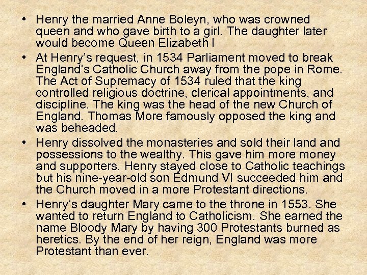 • Henry the married Anne Boleyn, who was crowned queen and who gave birth to a girl. The daughter later would become Queen Elizabeth I • At Henry’s request, in 1534 Parliament moved to break England’s Catholic Church away from the pope in Rome. The Act of Supremacy of 1534 ruled that the king controlled religious doctrine, clerical appointments, and discipline. The king was the head of the new Church of England. Thomas More famously opposed the king and was beheaded. • Henry dissolved the monasteries and sold their land possessions to the wealthy. This gave him more money and supporters. Henry stayed close to Catholic teachings but his nine-year-old son Edmund VI succeeded him and the Church moved in a more Protestant directions. • Henry’s daughter Mary came to the throne in 1553. She wanted to return England to Catholicism. She earned the name Bloody Mary by having 300 Protestants burned as heretics. By the end of her reign, England was more Protestant than ever.