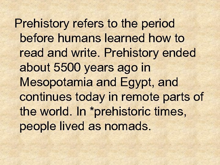 Prehistory refers to the period before humans learned how to read and write. Prehistory ended about 5500 years ago in Mesopotamia and Egypt, and continues today in remote parts of the world. In *prehistoric times, people lived as nomads.