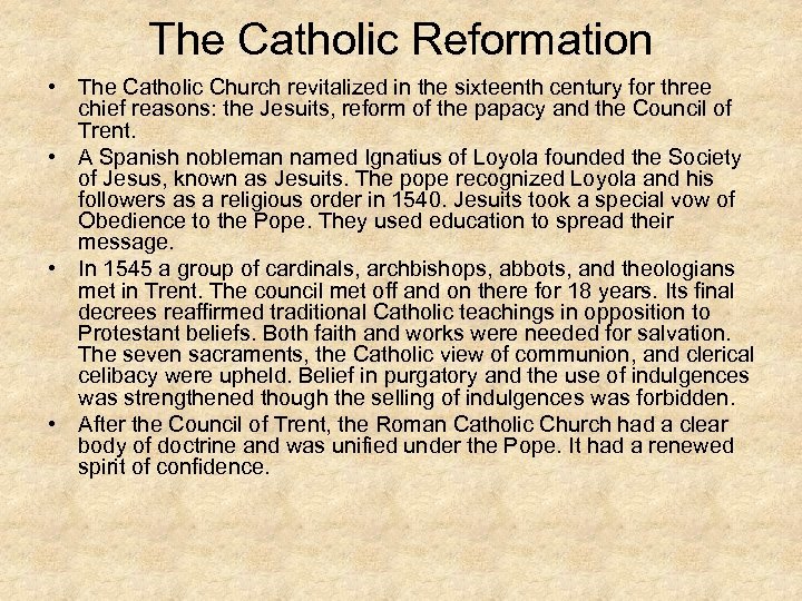 The Catholic Reformation • The Catholic Church revitalized in the sixteenth century for three chief reasons: the Jesuits, reform of the papacy and the Council of Trent. • A Spanish nobleman named Ignatius of Loyola founded the Society of Jesus, known as Jesuits. The pope recognized Loyola and his followers as a religious order in 1540. Jesuits took a special vow of Obedience to the Pope. They used education to spread their message. • In 1545 a group of cardinals, archbishops, abbots, and theologians met in Trent. The council met off and on there for 18 years. Its final decrees reaffirmed traditional Catholic teachings in opposition to Protestant beliefs. Both faith and works were needed for salvation. The seven sacraments, the Catholic view of communion, and clerical celibacy were upheld. Belief in purgatory and the use of indulgences was strengthened though the selling of indulgences was forbidden. • After the Council of Trent, the Roman Catholic Church had a clear body of doctrine and was unified under the Pope. It had a renewed spirit of confidence.