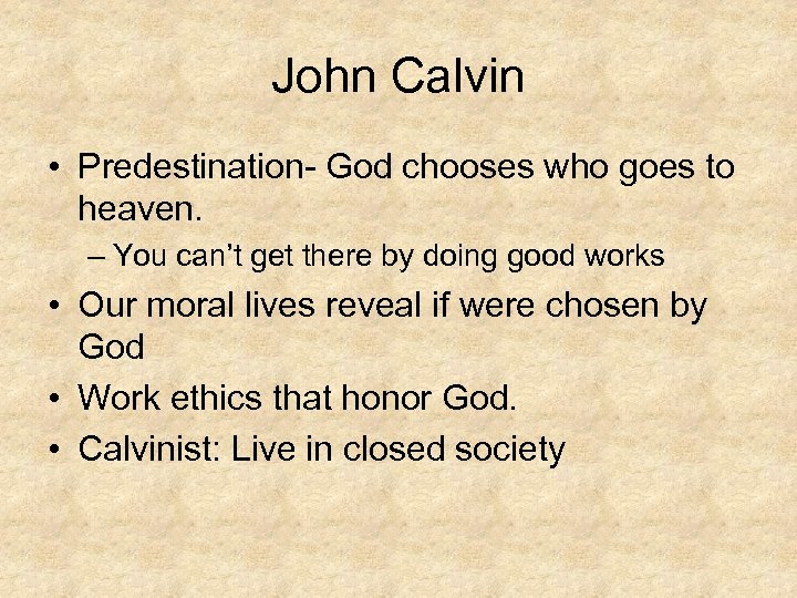 John Calvin • Predestination- God chooses who goes to heaven. – You can’t get there by doing good works • Our moral lives reveal if were chosen by God • Work ethics that honor God. • Calvinist: Live in closed society