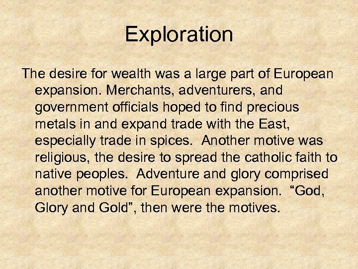 Exploration The desire for wealth was a large part of European expansion. Merchants, adventurers, and government officials hoped to find precious metals in and expand trade with the East, especially trade in spices. Another motive was religious, the desire to spread the catholic faith to native peoples. Adventure and glory comprised another motive for European expansion. “God, Glory and Gold”, then were the motives.