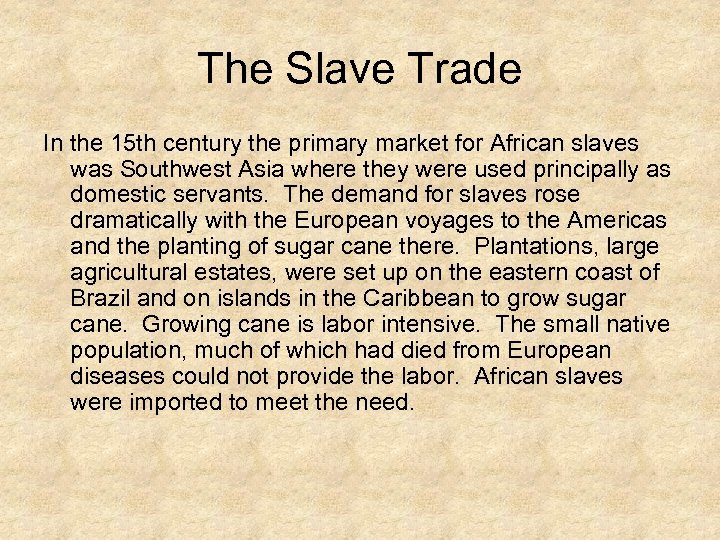 The Slave Trade In the 15 th century the primary market for African slaves was Southwest Asia where they were used principally as domestic servants. The demand for slaves rose dramatically with the European voyages to the Americas and the planting of sugar cane there. Plantations, large agricultural estates, were set up on the eastern coast of Brazil and on islands in the Caribbean to grow sugar cane. Growing cane is labor intensive. The small native population, much of which had died from European diseases could not provide the labor. African slaves were imported to meet the need.