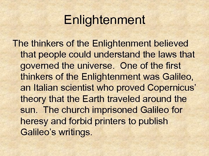 Enlightenment The thinkers of the Enlightenment believed that people could understand the laws that governed the universe. One of the first thinkers of the Enlightenment was Galileo, an Italian scientist who proved Copernicus’ theory that the Earth traveled around the sun. The church imprisoned Galileo for heresy and forbid printers to publish Galileo’s writings.