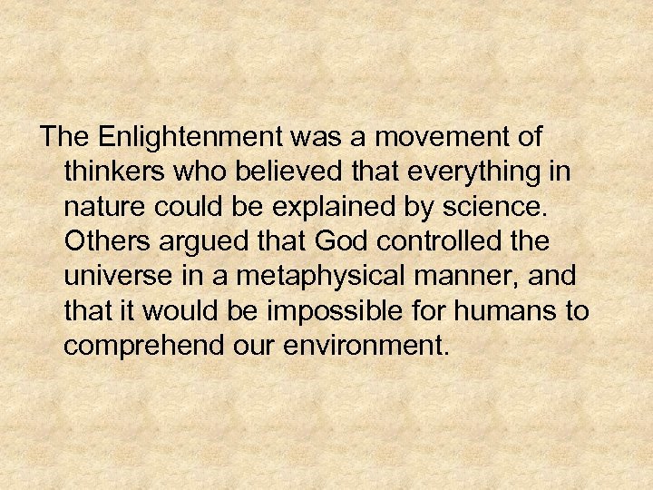 The Enlightenment was a movement of thinkers who believed that everything in nature could be explained by science. Others argued that God controlled the universe in a metaphysical manner, and that it would be impossible for humans to comprehend our environment.