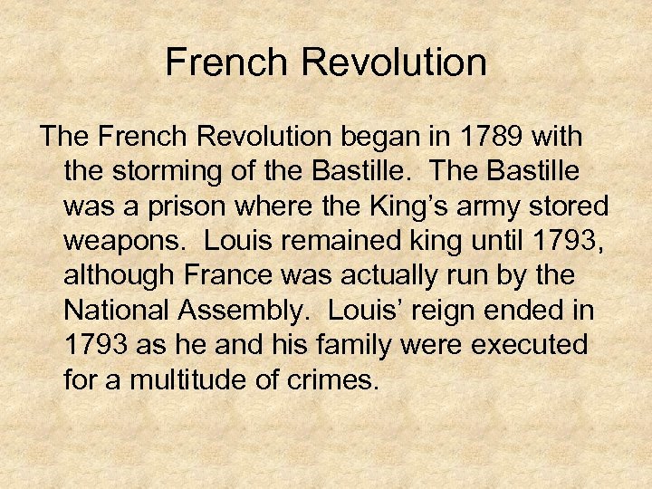 French Revolution The French Revolution began in 1789 with the storming of the Bastille. The Bastille was a prison where the King’s army stored weapons. Louis remained king until 1793, although France was actually run by the National Assembly. Louis’ reign ended in 1793 as he and his family were executed for a multitude of crimes.