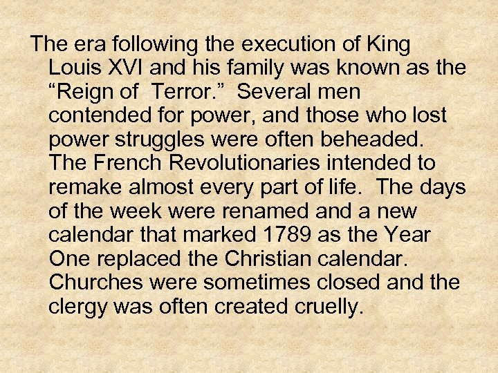 The era following the execution of King Louis XVI and his family was known as the “Reign of Terror. ” Several men contended for power, and those who lost power struggles were often beheaded. The French Revolutionaries intended to remake almost every part of life. The days of the week were renamed and a new calendar that marked 1789 as the Year One replaced the Christian calendar. Churches were sometimes closed and the clergy was often created cruelly.