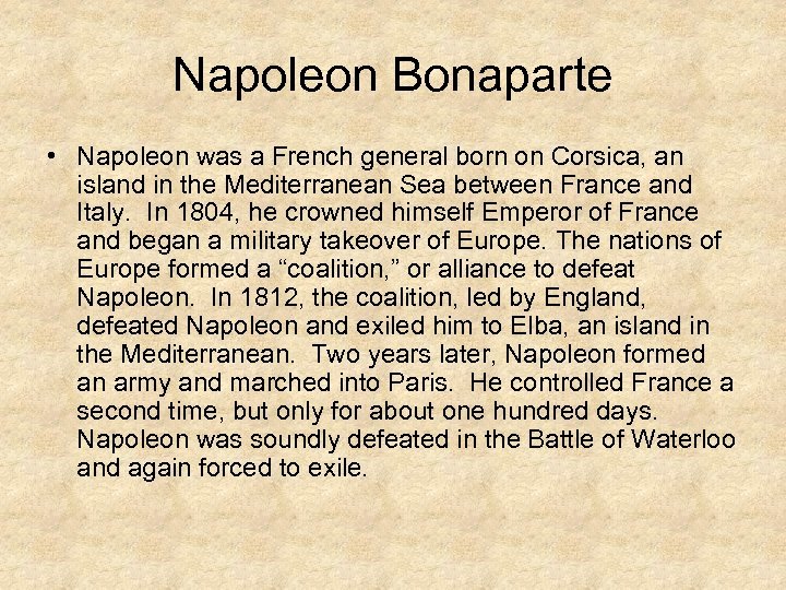 Napoleon Bonaparte • Napoleon was a French general born on Corsica, an island in the Mediterranean Sea between France and Italy. In 1804, he crowned himself Emperor of France and began a military takeover of Europe. The nations of Europe formed a “coalition, ” or alliance to defeat Napoleon. In 1812, the coalition, led by England, defeated Napoleon and exiled him to Elba, an island in the Mediterranean. Two years later, Napoleon formed an army and marched into Paris. He controlled France a second time, but only for about one hundred days. Napoleon was soundly defeated in the Battle of Waterloo and again forced to exile.