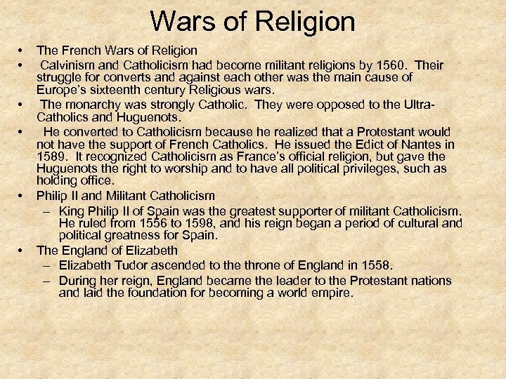 Wars of Religion • • • The French Wars of Religion Calvinism and Catholicism had become militant religions by 1560. Their struggle for converts and against each other was the main cause of Europe’s sixteenth century Religious wars. The monarchy was strongly Catholic. They were opposed to the Ultra. Catholics and Huguenots. He converted to Catholicism because he realized that a Protestant would not have the support of French Catholics. He issued the Edict of Nantes in 1589. It recognized Catholicism as France’s official religion, but gave the Huguenots the right to worship and to have all political privileges, such as holding office. Philip II and Militant Catholicism – King Philip II of Spain was the greatest supporter of militant Catholicism. He ruled from 1556 to 1598, and his reign began a period of cultural and political greatness for Spain. The England of Elizabeth – Elizabeth Tudor ascended to the throne of England in 1558. – During her reign, England became the leader to the Protestant nations and laid the foundation for becoming a world empire.