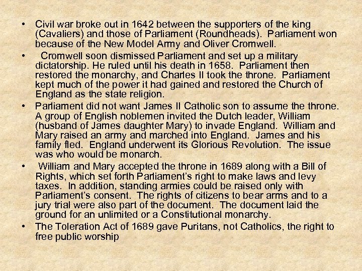 • Civil war broke out in 1642 between the supporters of the king (Cavaliers) and those of Parliament (Roundheads). Parliament won because of the New Model Army and Oliver Cromwell. • Cromwell soon dismissed Parliament and set up a military dictatorship. He ruled until his death in 1658. Parliament then restored the monarchy, and Charles II took the throne. Parliament kept much of the power it had gained and restored the Church of England as the state religion. • Parliament did not want James II Catholic son to assume throne. A group of English noblemen invited the Dutch leader, William (husband of James daughter Mary) to invade England. William and Mary raised an army and marched into England. James and his family fled. England underwent its Glorious Revolution. The issue was who would be monarch. • William and Mary accepted the throne in 1689 along with a Bill of Rights, which set forth Parliament’s right to make laws and levy taxes. In addition, standing armies could be raised only with Parliament’s consent. The rights of citizens to bear arms and to a jury trial were also part of the document. The document laid the ground for an unlimited or a Constitutional monarchy. • The Toleration Act of 1689 gave Puritans, not Catholics, the right to free public worship