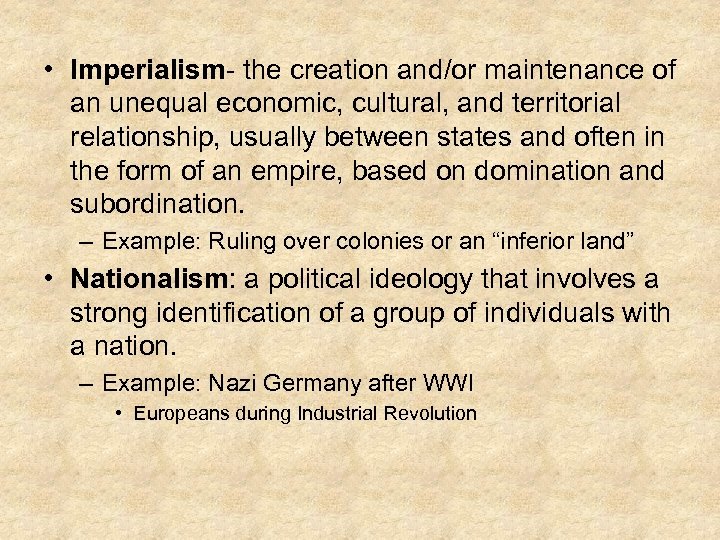 • Imperialism- the creation and/or maintenance of an unequal economic, cultural, and territorial relationship, usually between states and often in the form of an empire, based on domination and subordination. – Example: Ruling over colonies or an “inferior land” • Nationalism: a political ideology that involves a strong identification of a group of individuals with a nation. – Example: Nazi Germany after WWI • Europeans during Industrial Revolution