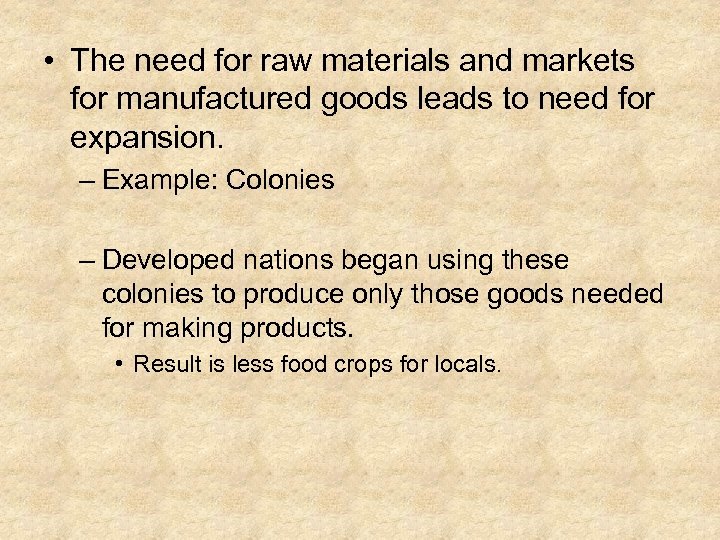 • The need for raw materials and markets for manufactured goods leads to need for expansion. – Example: Colonies – Developed nations began using these colonies to produce only those goods needed for making products. • Result is less food crops for locals.