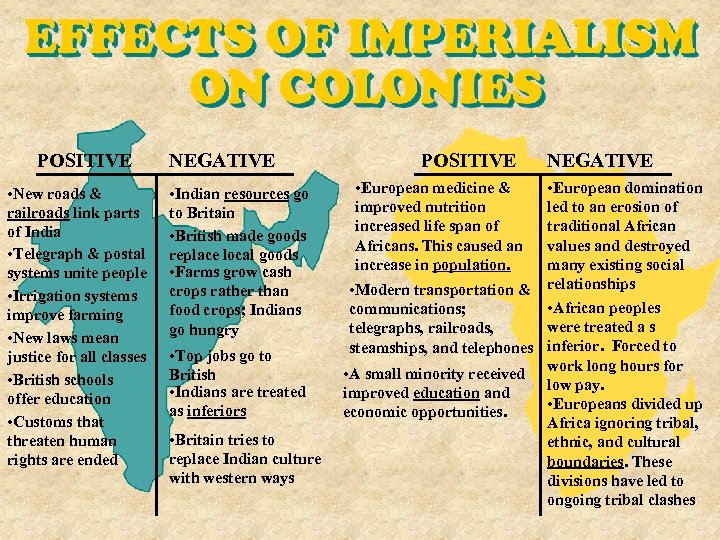 POSITIVE • New roads & railroads link parts of India • Telegraph & postal systems unite people • Irrigation systems improve farming • New laws mean justice for all classes • British schools offer education • Customs that threaten human rights are ended NEGATIVE • Indian resources go to Britain • British made goods replace local goods • Farms grow cash crops rather than food crops; Indians go hungry • Top jobs go to British • Indians are treated as inferiors • Britain tries to replace Indian culture with western ways POSITIVE • European medicine & improved nutrition increased life span of Africans. This caused an increase in population. NEGATIVE • European domination led to an erosion of traditional African values and destroyed many existing social • Modern transportation & relationships • African peoples communications; were treated a s telegraphs, railroads, steamships, and telephones inferior. Forced to work long hours for • A small minority received low pay. improved education and • Europeans divided up economic opportunities. Africa ignoring tribal, ethnic, and cultural boundaries. These divisions have led to ongoing tribal clashes
