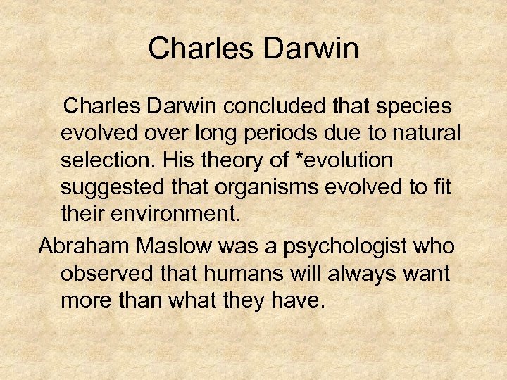 Charles Darwin concluded that species evolved over long periods due to natural selection. His theory of *evolution suggested that organisms evolved to fit their environment. Abraham Maslow was a psychologist who observed that humans will always want more than what they have.