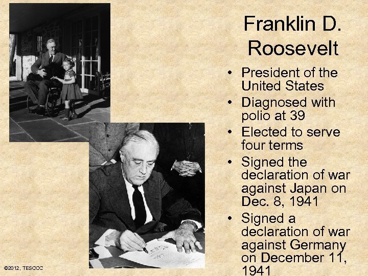 Franklin D. Roosevelt © 2012, TESCCC • President of the United States • Diagnosed with polio at 39 • Elected to serve four terms • Signed the declaration of war against Japan on Dec. 8, 1941 • Signed a declaration of war against Germany on December 11, 1941