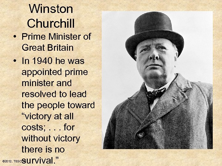 Winston Churchill • Prime Minister of Great Britain • In 1940 he was appointed prime minister and resolved to lead the people toward “victory at all costs; . . . for without victory there is no survival. ” © 2012, TESCCC