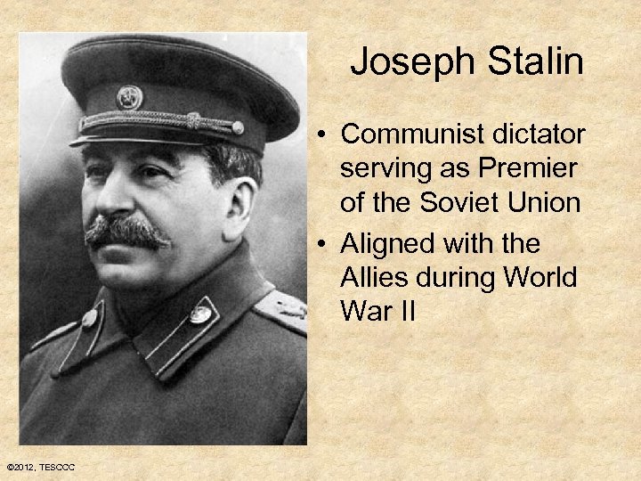 Joseph Stalin • Communist dictator serving as Premier of the Soviet Union • Aligned with the Allies during World War II © 2012, TESCCC