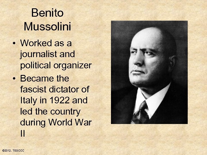 Benito Mussolini • Worked as a journalist and political organizer • Became the fascist dictator of Italy in 1922 and led the country during World War II © 2012, TESCCC