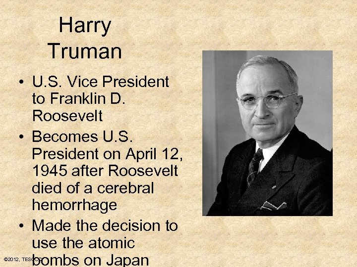 Harry Truman • U. S. Vice President to Franklin D. Roosevelt • Becomes U. S. President on April 12, 1945 after Roosevelt died of a cerebral hemorrhage • Made the decision to use the atomic bombs on Japan © 2012, TESCCC