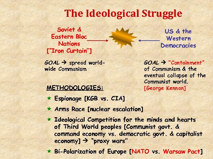 The Ideological Struggle Soviet & Eastern Bloc Nations [“Iron Curtain”] GOAL spread worldwide Communism METHODOLOGIES: US & the Western Democracies GOAL “Containment” of Communism & the eventual collapse of the Communist world. [George Kennan] « Espionage [KGB vs. CIA] « Arms Race [nuclear escalation] « Ideological Competition for the minds and hearts of Third World peoples [Communist govt. & command economy vs. democratic govt. & capitalist economy] “proxy wars” « Bi-Polarization of Europe [NATO vs. Warsaw Pact]