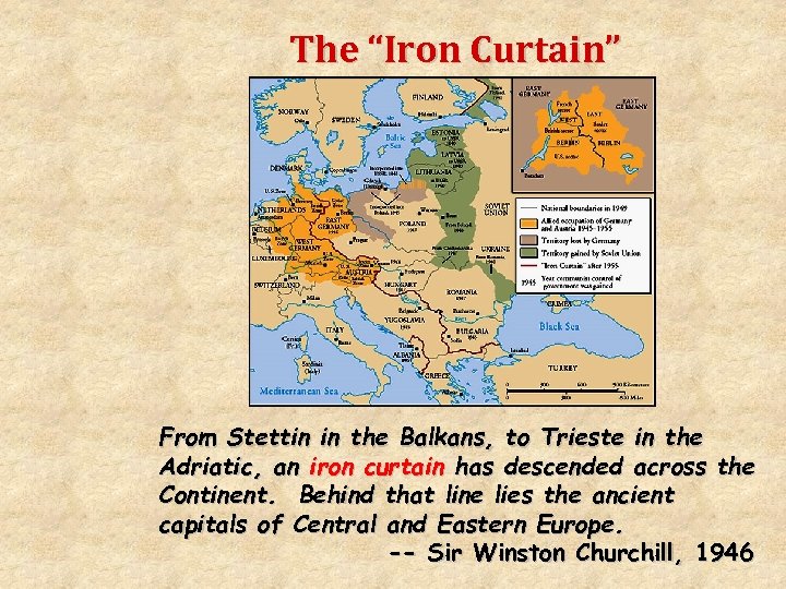 The “Iron Curtain” From Stettin in the Balkans, to Trieste in the Adriatic, an iron curtain has descended across the Continent. Behind that line lies the ancient capitals of Central and Eastern Europe. -- Sir Winston Churchill, 1946