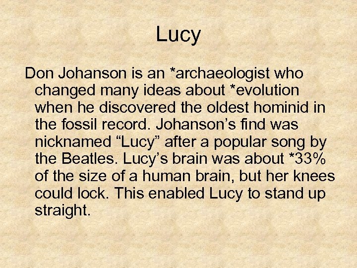 Lucy Don Johanson is an *archaeologist who changed many ideas about *evolution when he discovered the oldest hominid in the fossil record. Johanson’s find was nicknamed “Lucy” after a popular song by the Beatles. Lucy’s brain was about *33% of the size of a human brain, but her knees could lock. This enabled Lucy to stand up straight.