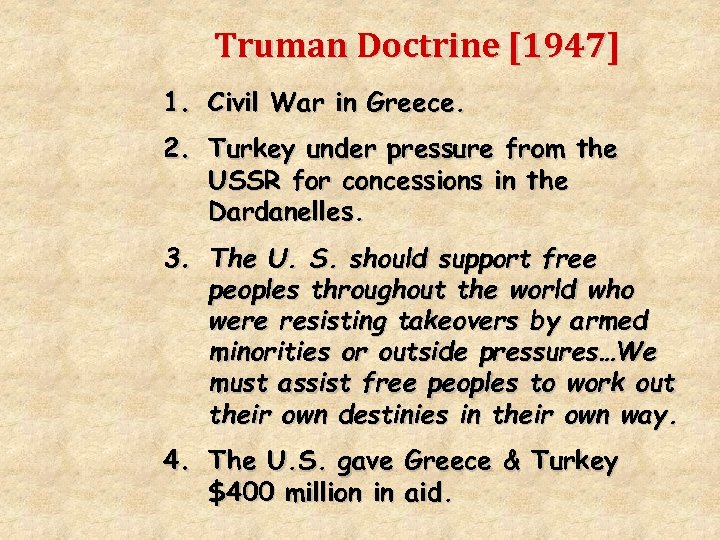 Truman Doctrine [1947] 1. Civil War in Greece. 2. Turkey under pressure from the USSR for concessions in the Dardanelles. 3. The U. S. should support free peoples throughout the world who were resisting takeovers by armed minorities or outside pressures…We must assist free peoples to work out their own destinies in their own way. 4. The U. S. gave Greece & Turkey $400 million in aid.