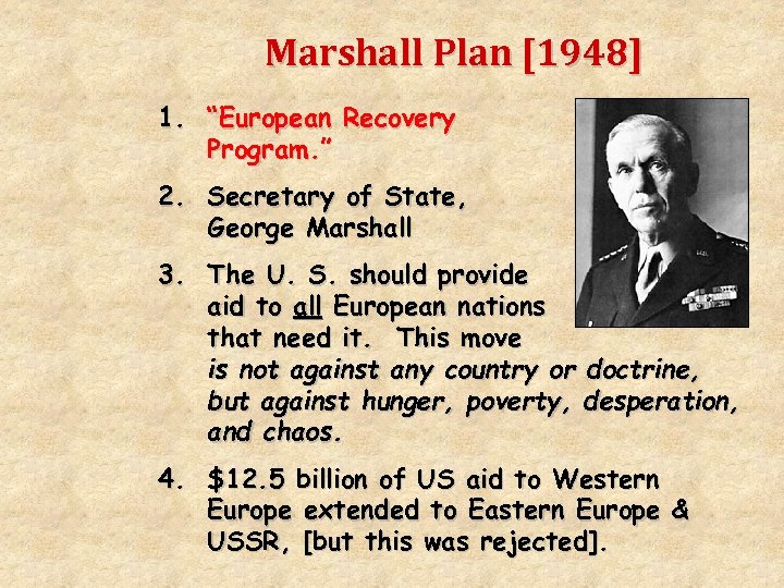 Marshall Plan [1948] 1. “European Recovery Program. ” 2. Secretary of State, George Marshall 3. The U. S. should provide aid to all European nations that need it. This move is not against any country or doctrine, but against hunger, poverty, desperation, and chaos. 4. $12. 5 billion of US aid to Western Europe extended to Eastern Europe & USSR, [but this was rejected].