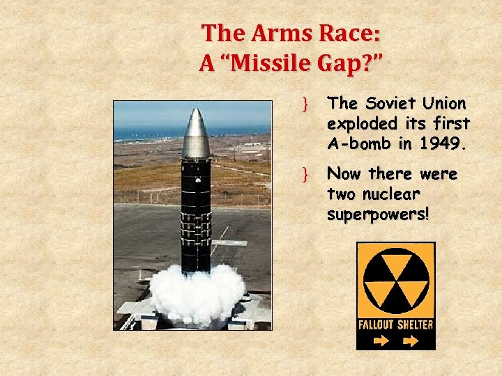 The Arms Race: A “Missile Gap? ” } The Soviet Union exploded its first A-bomb in 1949. } Now there were two nuclear superpowers!
