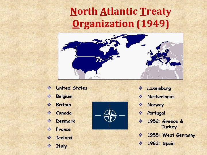 North Atlantic Treaty Organization (1949) v United States v Luxemburg v Belgium v Netherlands v Britain v Norway v Canada v Portugal v Denmark v 1952: Greece & v France v Iceland v Italy Turkey v 1955: West Germany v 1983: Spain