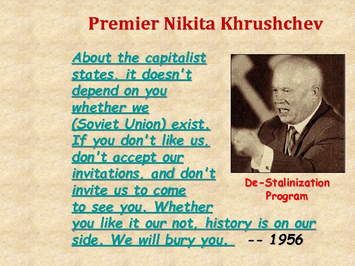 Premier Nikita Khrushchev About the capitalist states, it doesn't depend on you whether we (Soviet Union) exist. If you don't like us, don't accept our invitations, and don't De-Stalinization invite us to come Program to see you. Whether you like it our not, history is on our side. We will bury you. -- 1956