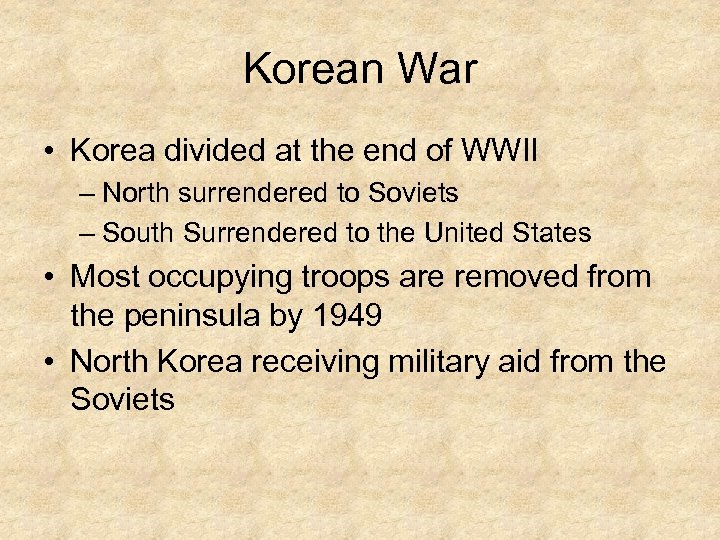 Korean War • Korea divided at the end of WWII – North surrendered to Soviets – South Surrendered to the United States • Most occupying troops are removed from the peninsula by 1949 • North Korea receiving military aid from the Soviets