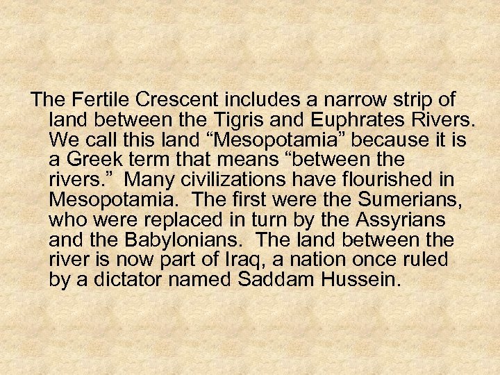 The Fertile Crescent includes a narrow strip of land between the Tigris and Euphrates Rivers. We call this land “Mesopotamia” because it is a Greek term that means “between the rivers. ” Many civilizations have flourished in Mesopotamia. The first were the Sumerians, who were replaced in turn by the Assyrians and the Babylonians. The land between the river is now part of Iraq, a nation once ruled by a dictator named Saddam Hussein.