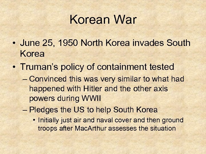 Korean War • June 25, 1950 North Korea invades South Korea • Truman’s policy of containment tested – Convinced this was very similar to what had happened with Hitler and the other axis powers during WWII – Pledges the US to help South Korea • Initially just air and naval cover and then ground troops after Mac. Arthur assesses the situation