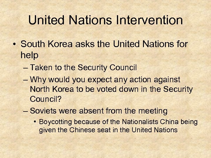 United Nations Intervention • South Korea asks the United Nations for help – Taken to the Security Council – Why would you expect any action against North Korea to be voted down in the Security Council? – Soviets were absent from the meeting • Boycotting because of the Nationalists China being given the Chinese seat in the United Nations