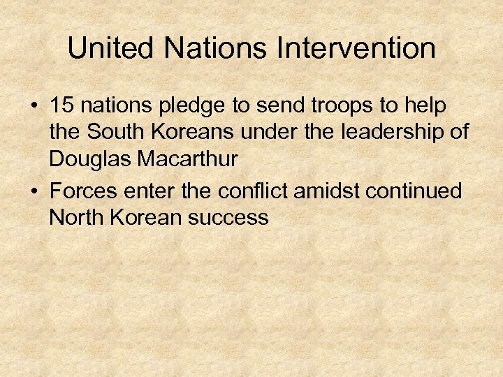 United Nations Intervention • 15 nations pledge to send troops to help the South Koreans under the leadership of Douglas Macarthur • Forces enter the conflict amidst continued North Korean success
