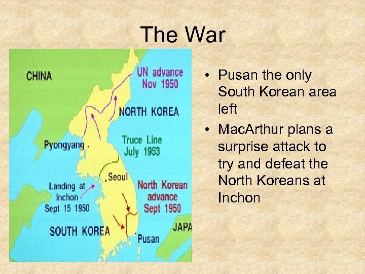 The War • Pusan the only South Korean area left • Mac. Arthur plans a surprise attack to try and defeat the North Koreans at Inchon