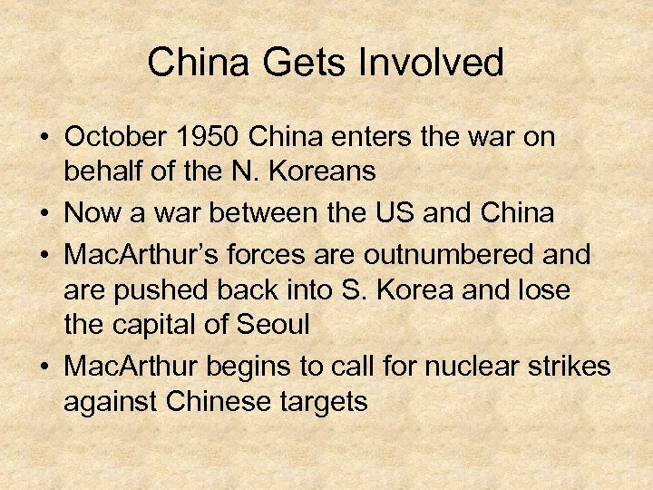China Gets Involved • October 1950 China enters the war on behalf of the N. Koreans • Now a war between the US and China • Mac. Arthur’s forces are outnumbered and are pushed back into S. Korea and lose the capital of Seoul • Mac. Arthur begins to call for nuclear strikes against Chinese targets