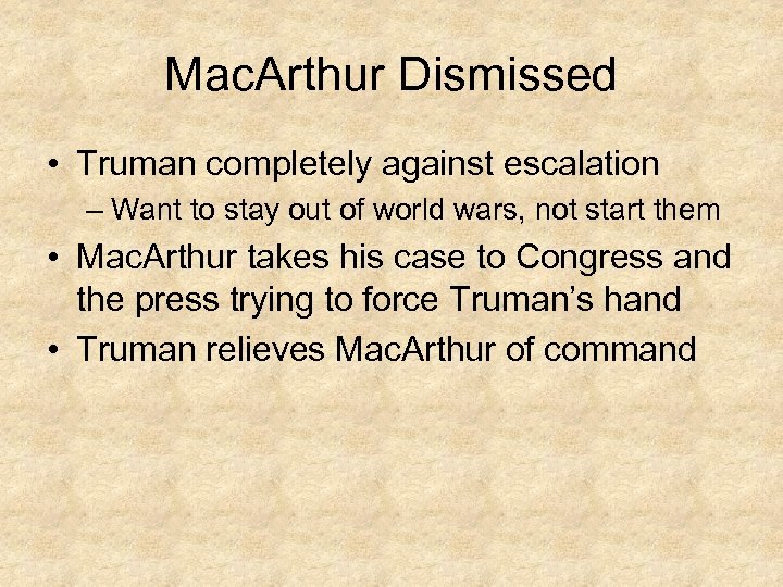 Mac. Arthur Dismissed • Truman completely against escalation – Want to stay out of world wars, not start them • Mac. Arthur takes his case to Congress and the press trying to force Truman’s hand • Truman relieves Mac. Arthur of command