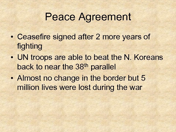 Peace Agreement • Ceasefire signed after 2 more years of fighting • UN troops are able to beat the N. Koreans back to near the 38 th parallel • Almost no change in the border but 5 million lives were lost during the war