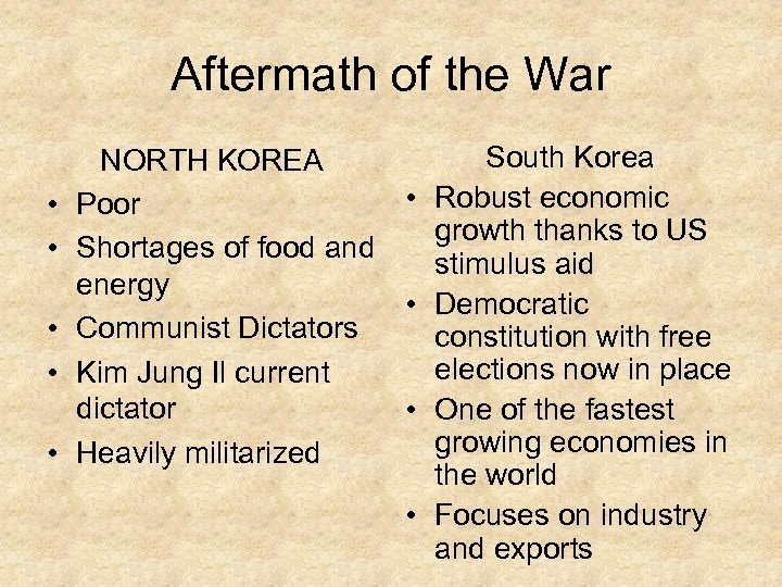 Aftermath of the War • • • South Korea NORTH KOREA • Robust economic Poor growth thanks to US Shortages of food and stimulus aid energy • Democratic Communist Dictators constitution with free elections now in place Kim Jung Il current dictator • One of the fastest growing economies in Heavily militarized the world • Focuses on industry and exports